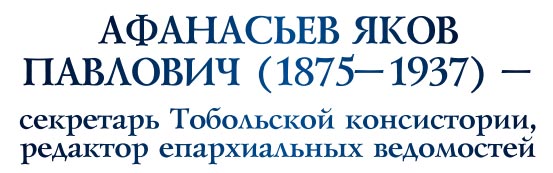 ![]() На территории Тобольского кремля жил и трудился мой предок (прапрадед), надворный советник, секретарь Тобольской духовной консистории и редактор «Тобольских епархиальных ведомостей» Яков Павлович Афанасьев (1875–1937).