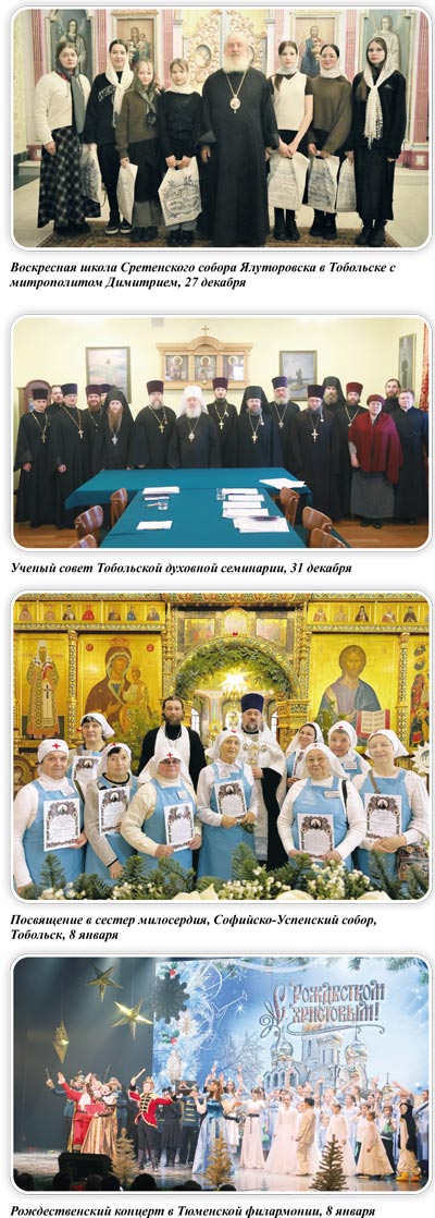 9 января митрополит Димитрий и все священнослужители Тюменского благочиния совершили Божественную литургию в Благовещенском соборе Тюмени. После богослужения прошло собрание духовенства с владыкой. Рождественские концерты проходят на всех приходах Тобольской митрополии, устраивают их обычно преподаватели и дети воскресных школ. Так, 8 января в Тюменской филармонии состоялся концерт, подготовленный учащимися и педагогами воскресных школ и православной гимназии Тюмени. Зрители увидели постановку «Щелкунчик и мышиный король» по мотивам сказки Гофмана. А 11 января был показан концерт в Тобольском драматическом театре. Молодежная студия-театр «Благовест» при храме Семи отроков Ефесских представила спектакль по мотивам произведений Диккенса «Тайна старого колокола». 13 января митрополит Димитрий посетил приход строящегося храма Всех Святых в земле Русской просиявших г. Тюмени. Встречали архиерея благочинный протоиерей Михаил Безукладников, настоятель храма иерей Константин Пирожников, взрослые прихожане и дети. Владыка обратился к присутствующим: «Дорогие братья и сестры, я искренне рад посетить приход, увидеть, как идет строительство храма, увидеть добрые лица прихожан, которые не унывают. Конечно, с молитвой, с помощью Божией, этот великий труд – строительство храма – будет исполнен. Построить храм, дом Божий – это величайшее дело. Это то место, которое будет помогать людям соединяться с вечностью, с Богом, для духовного укрепления и спасения души». Далее архипастырь ознакомился с ходом строительства. Первоочередная задача сейчас – это монтаж кровли, а затем установка куполов и крестов. 14 января митрополит Димитрий совершил литургию в Богородице-Рождественском женском монастыре. Затем владыка посетил концерт, подготовленный силами педагогов и детей пансиона «Отрада» при монастыре. 15 января митрополит Димитрий посетил Тюменское президентское кадетское училище. Владыка провел занятие с кадетами по басням Ивана Андреевича Крылова, провел параллели между сюжетами басен и событиями из истории нашей страны, цитировал фрагменты из своей книги «Размышления над баснями Крылова». Утром 15 января после богослужения в казачьем храме прп. Серафима Саровского глава Тобольской митрополии в сопровождении настоятеля иерея Владимира Язова ознакомился с ходом строительства здания воскресной школы.