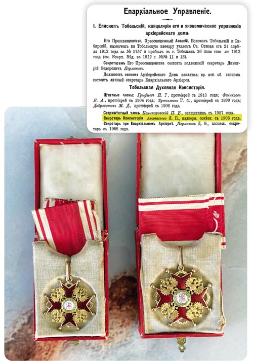 Яков Павлович родился в Петербурге в 1875 году. Вероятнее всего, там же он окончил университет, дослужившись до чина титулярного советника. Его история в Тобольской губернии начинается с 1908 года. Тогда он был назначен исполняющим обязанности секретаря Тобольской духовной консистории с дальнейшим утверждением в этой должности. С 1909 года он – член Тобольского епархиального училищного совета и комитета по изысканию средств для церковных школ епархии. За два года в этой должности он дослужился до чина надворного советника. В нашей семье сохранились и его государственные награды, в частности ордена святого Станислава II и III степени.