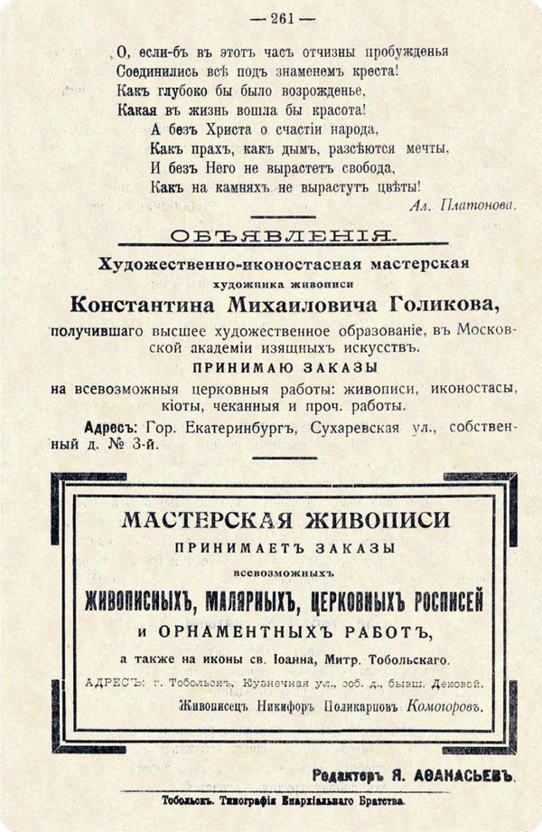 На территории Тобольского кремля жил и трудился мой предок (прапрадед), надворный советник, секретарь Тобольской духовной консистории и редактор «Тобольских епархиальных ведомостей» Яков Павлович Афанасьев (1875–1937).