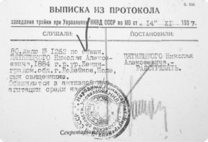В 1920 г. тюменский протоиерей Михаил Иноземцев в своем рапорте в Тобольский епархиальный совет сообщал: «Вследствие распространившейся паники в населении и духовенстве г. Тюмени перед приходом Красной Армии, Благочиннический Совет в полном составе эвакуировался, а также в полном составе эвакуировались причты Соборной, Спасской, Благовещенской, Крестовоздвиженской, Успенской, Михаило-Архангельской и Вознесенской церкви». Последняя запись о совершении о. Николаем таинства Крещения, зафиксированная в метрической книге Спасской церкви за 1919 год, датируется маем. Ровно через год он вернулся из Томска в Тюмень и спустя некоторое время получил назначение в Ялуторовск. В каком составе семья возвратилась из томской эвакуации, остается неизвестным. Вполне вероятно, что батюшка потерял жену и младшего сына в кровавом месиве гражданской войны, сопровождавшейся жестокой эпидемией тифа. В удостоверении личности, выданном Н. А. Пятницкому в 1926 г., в графе «Семейное положение» значится: «Вдов», в графе «Лица, внесенные в удостоверение» указаны лишь трое старших сыновей. Первый арестДо своего первого ареста Николай Пятницкий около десяти лет прослужил в Ялуторовской Успенско-Никольской кладбищенской церкви и в Ялуторовском уезде. В 1924 г. здесь было образовано Ялуторовское викариатство Тобольской епархии, викарным епископом которого был избран Серафим (Коровин). Келейник владыки Алексей Креков, проходивший по групповому делу священнослужителей и мирян г. Тюмени 1937 г., на допросе показал: «Пятницкого Николая, священника Ялуторовского уезда, знаю с 1924 года. После его ареста я его не видел, и где он сейчас находится, мне неизвестно». Николай Алексеевич Пятницкий был арестован Тюменским ОГПУ в 1931 г. и находился в тюремном заключении на протяжении пяти месяцев; архивное следственное дело утрачено. Этим объясняется тот факт, что он не проходил по групповому делу архиепископа Иринарха Синеокова-Андреевского 1932 г., одним из главных обвиняемых по которому выступал епископ Ялуторовский Серафим и большое число священнослужителей Тобольской епархии. Священномучениче Николае, моли Бога о нас!