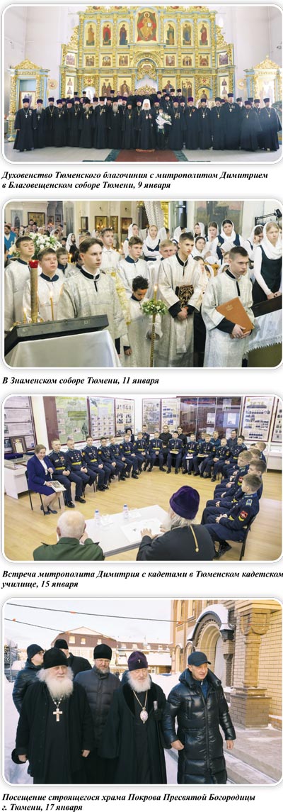 9 января митрополит Димитрий и все священнослужители Тюменского благочиния совершили Божественную литургию в Благовещенском соборе Тюмени. После богослужения прошло собрание духовенства с владыкой. Рождественские концерты проходят на всех приходах Тобольской митрополии, устраивают их обычно преподаватели и дети воскресных школ. Так, 8 января в Тюменской филармонии состоялся концерт, подготовленный учащимися и педагогами воскресных школ и православной гимназии Тюмени. Зрители увидели постановку «Щелкунчик и мышиный король» по мотивам сказки Гофмана. А 11 января был показан концерт в Тобольском драматическом театре. Молодежная студия-театр «Благовест» при храме Семи отроков Ефесских представила спектакль по мотивам произведений Диккенса «Тайна старого колокола». 13 января митрополит Димитрий посетил приход строящегося храма Всех Святых в земле Русской просиявших г. Тюмени. Встречали архиерея благочинный протоиерей Михаил Безукладников, настоятель храма иерей Константин Пирожников, взрослые прихожане и дети. Владыка обратился к присутствующим: «Дорогие братья и сестры, я искренне рад посетить приход, увидеть, как идет строительство храма, увидеть добрые лица прихожан, которые не унывают. Конечно, с молитвой, с помощью Божией, этот великий труд – строительство храма – будет исполнен. Построить храм, дом Божий – это величайшее дело. Это то место, которое будет помогать людям соединяться с вечностью, с Богом, для духовного укрепления и спасения души». Далее архипастырь ознакомился с ходом строительства. Первоочередная задача сейчас – это монтаж кровли, а затем установка куполов и крестов. 14 января митрополит Димитрий совершил литургию в Богородице-Рождественском женском монастыре. Затем владыка посетил концерт, подготовленный силами педагогов и детей пансиона «Отрада» при монастыре. 15 января митрополит Димитрий посетил Тюменское президентское кадетское училище. Владыка провел занятие с кадетами по басням Ивана Андреевича Крылова, провел параллели между сюжетами басен и событиями из истории нашей страны, цитировал фрагменты из своей книги «Размышления над баснями Крылова». Утром 15 января после богослужения в казачьем храме прп. Серафима Саровского глава Тобольской митрополии в сопровождении настоятеля иерея Владимира Язова ознакомился с ходом строительства здания воскресной школы.