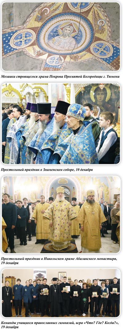 4 декабря 2025 года, в день праздника Введения во храм Пресвятой Богородицы, митрополит Тобольский и Тюменский Димитрий совершил Божественную литургию в Иоанно-Введенском женском монастыре. На службе молились священнослужители Тобольска, Абалакского мужского и Иоанно-Введенского женского монастырей, настоятельница игумения Анна (Куртова) с сестрами обители, преподаватели и студенты Тобольской духовной семинарии, регентской школы, учащиеся Тобольской православной гимназии, прихожане и паломники. А 10 декабря свой престольный праздник отмечал Знаменский кафедральный собор Тюмени, где богослужение также возглавил митрополит Димитрий с сонмом духовенства, при стечении многочисленных прихожан, учащихся духовного училища и православной гимназии города. Настоятелю и прихожанам тюменского храма иконы Божией Матери «Утоли моя печали» вручили медаль «За помощь фронту» и благодарственное письмо от коллектива 108-го гвардейского десантно-штурмового полка за оказанную помощь в условиях проведения специальной военной операции. А студенты-сварщики Тюменского колледжа транспортных технологий и сервиса по спецзаказу изготовили 15 тележек для наших бойцов. С инициативой и проектом данных тележек, которые могут использоваться и для подвоза всего необходимого, и для эвакуации раненых, к сотрудникам колледжа обратился протоиерей Николай Егоров, настоятель храма Архангела Михаила города Тюмени. 11 декабря в Храме Христа Спасителя в Москве прошло подведение итогов финального этапа XX Всероссийского конкурса в области педагогики, воспитания и работы с детьми и молодежью «За нравственный подвиг учителя». В завершающем этапе конкурса участвовало 55 работ из 8 федеральных округов. В числе призеров комиссией отмечена Ольга Смолина, преподаватель русского языка и литературы Тюменского президентского кадетского училища, за проект «Развитие чувства патриотизма у кадет 12–13 лет в условиях реализации дополнительной общеобразовательной программы “Святые воины”».